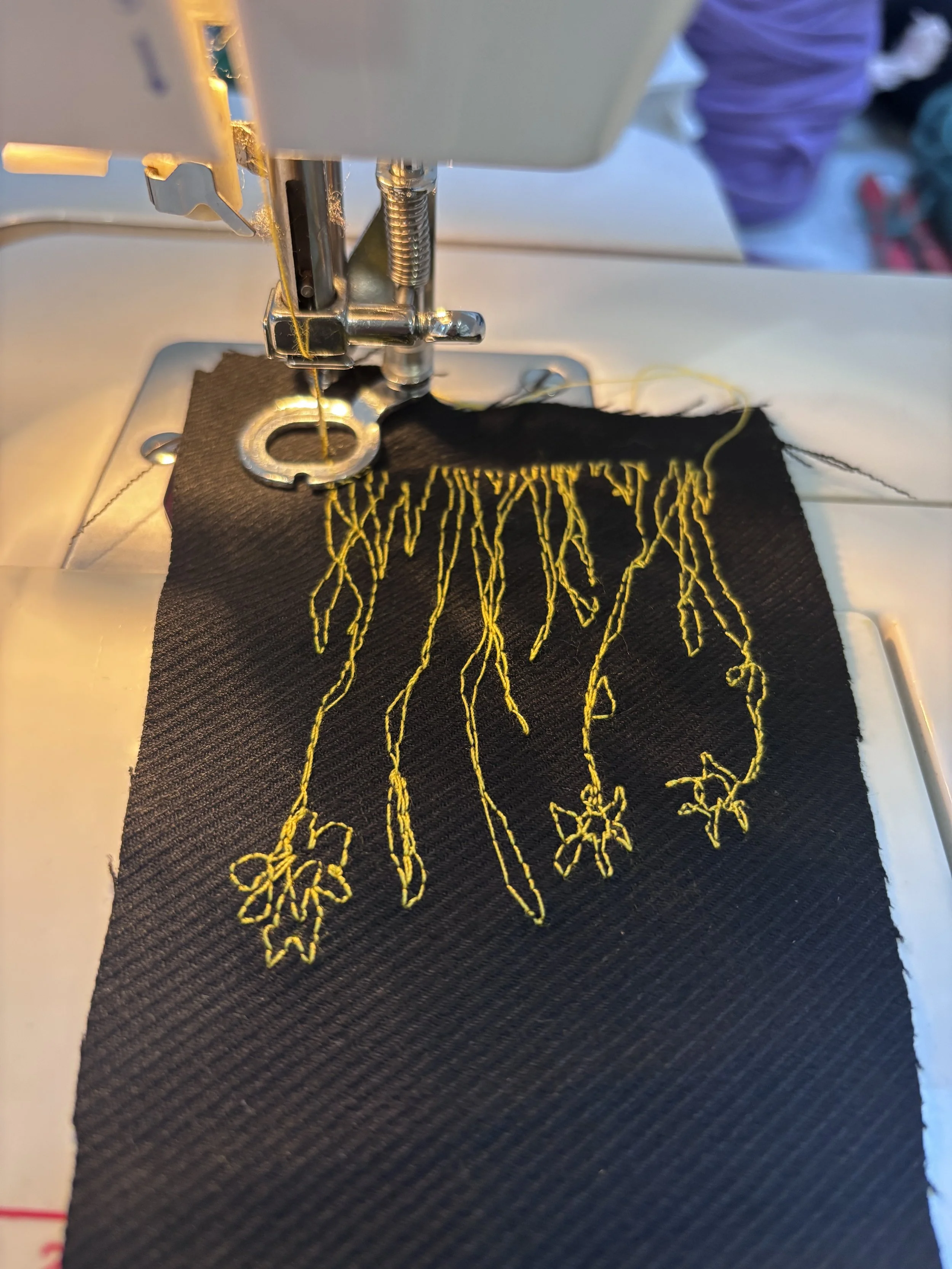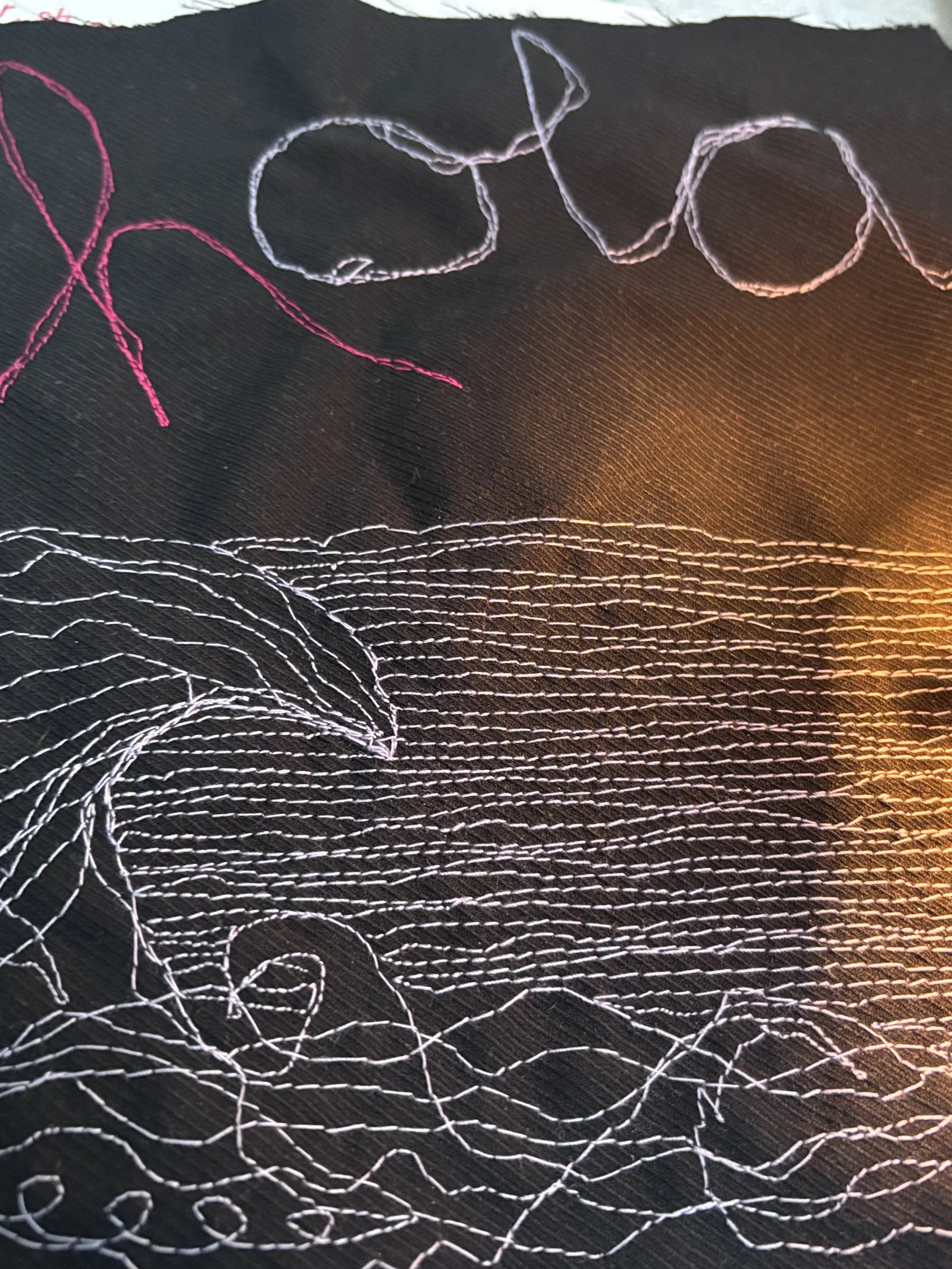 My textile practice explores machine drawing, repair, adaptation, dressmaking, and embodied mark-making. I work across sewing and crochet as relational and material forms of inquiry.